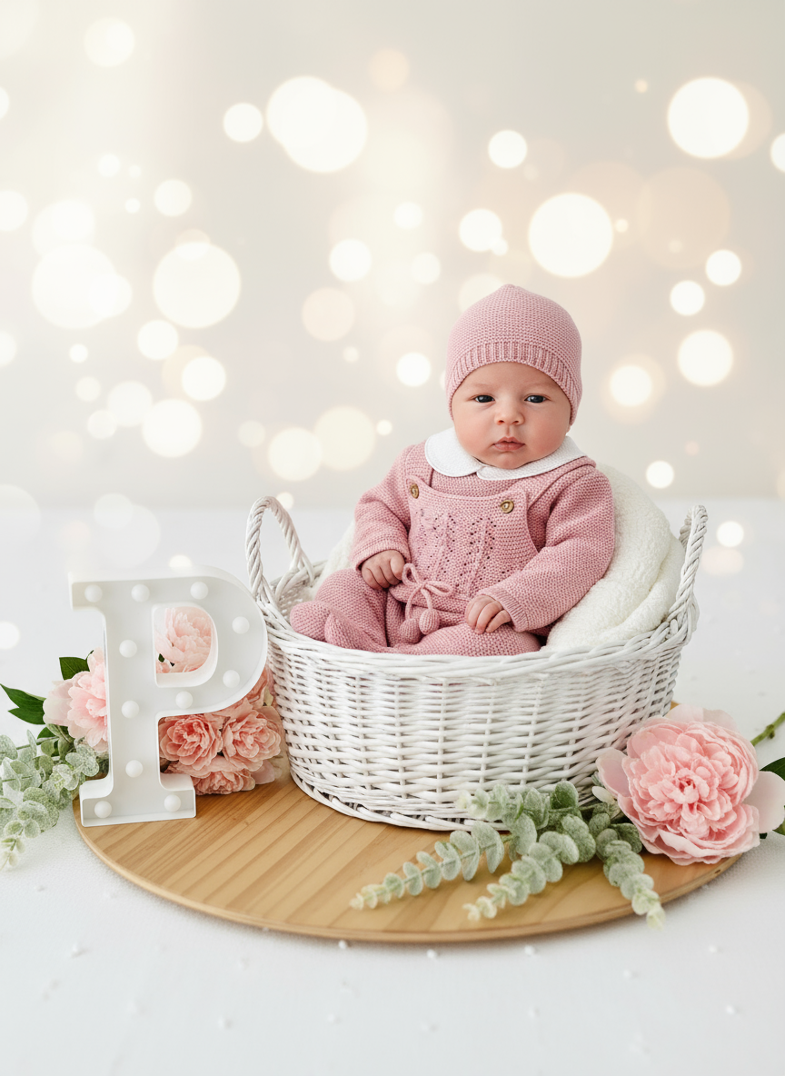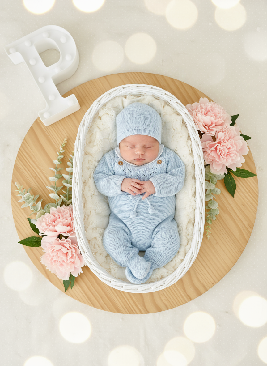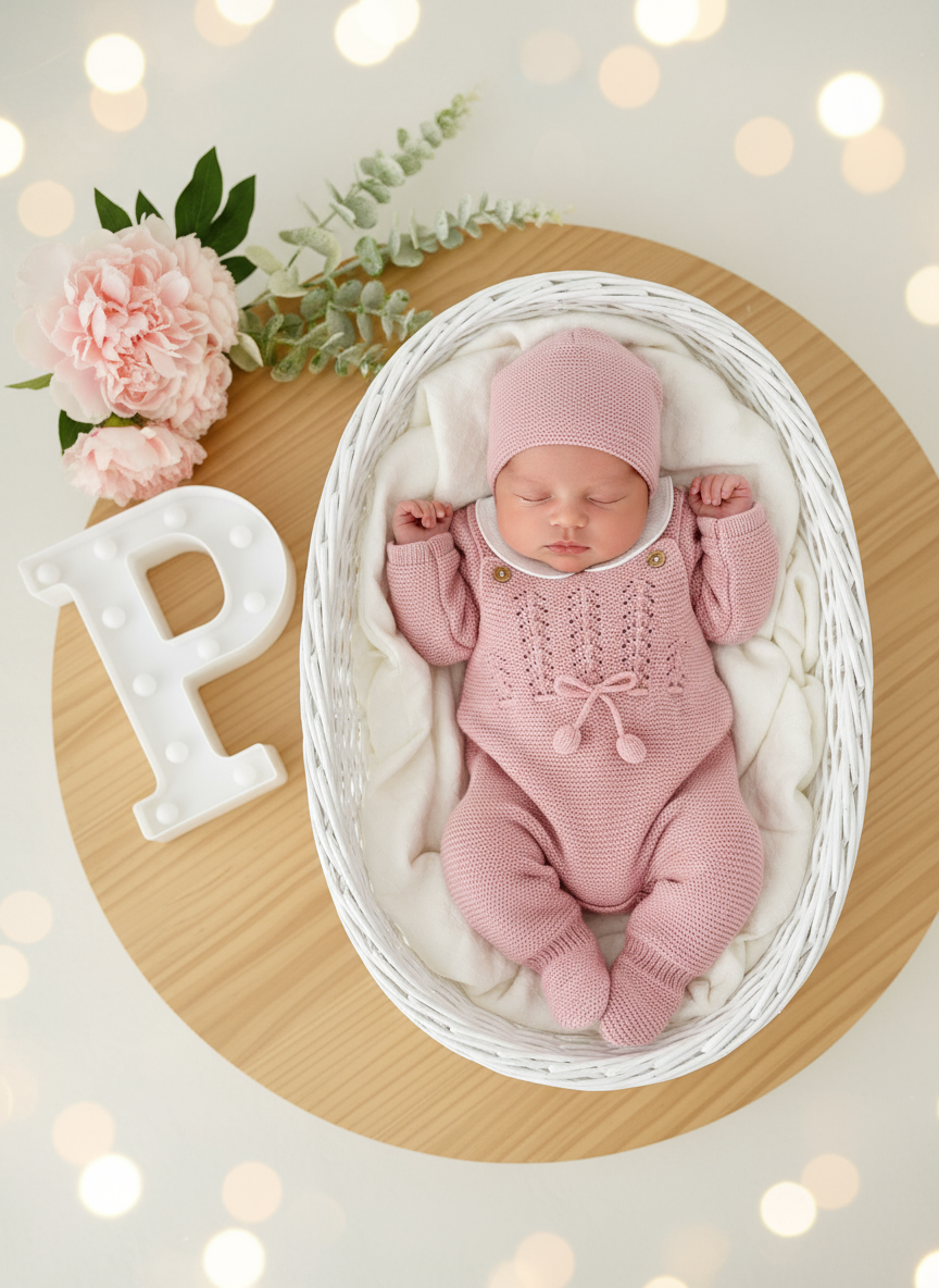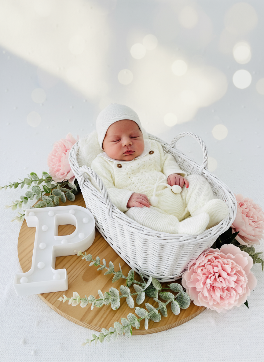 Celebre a chegada do seu bebé com este conjunto encantador de 3 peças em tricot de alta qualidade: