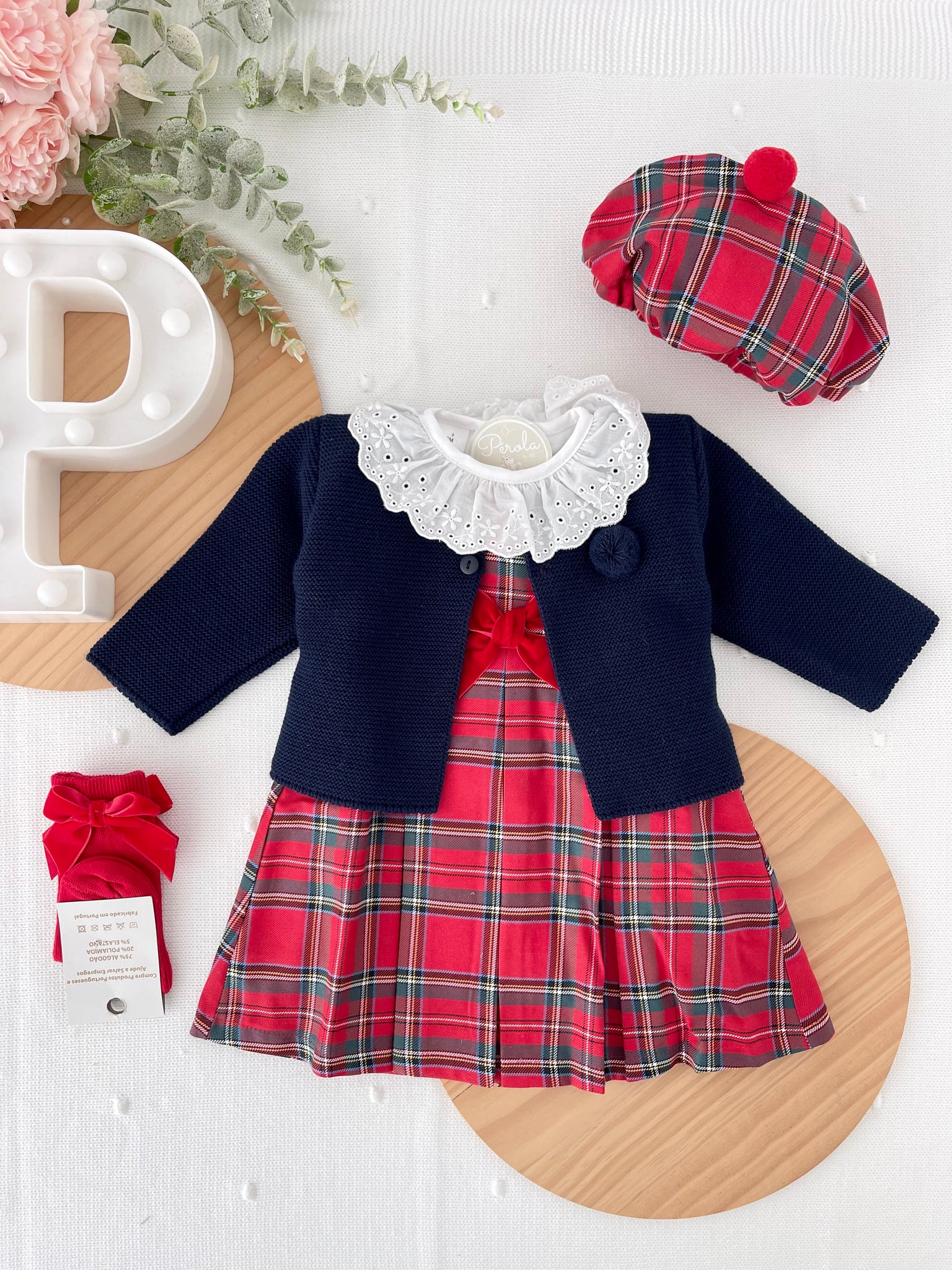 Conjunto Menina Tartan Vermelho e azul- Vestido, Blusa e Boina Natalícia